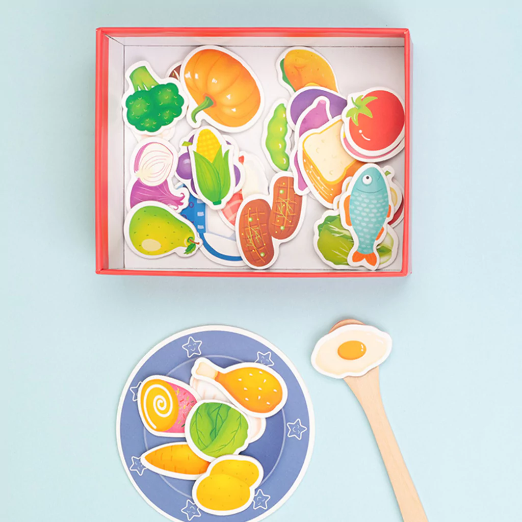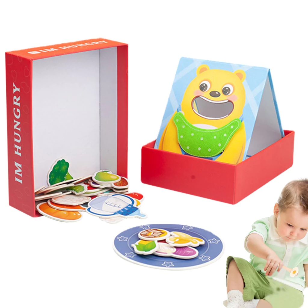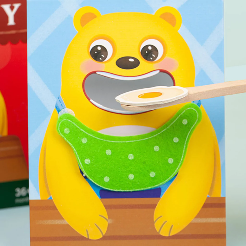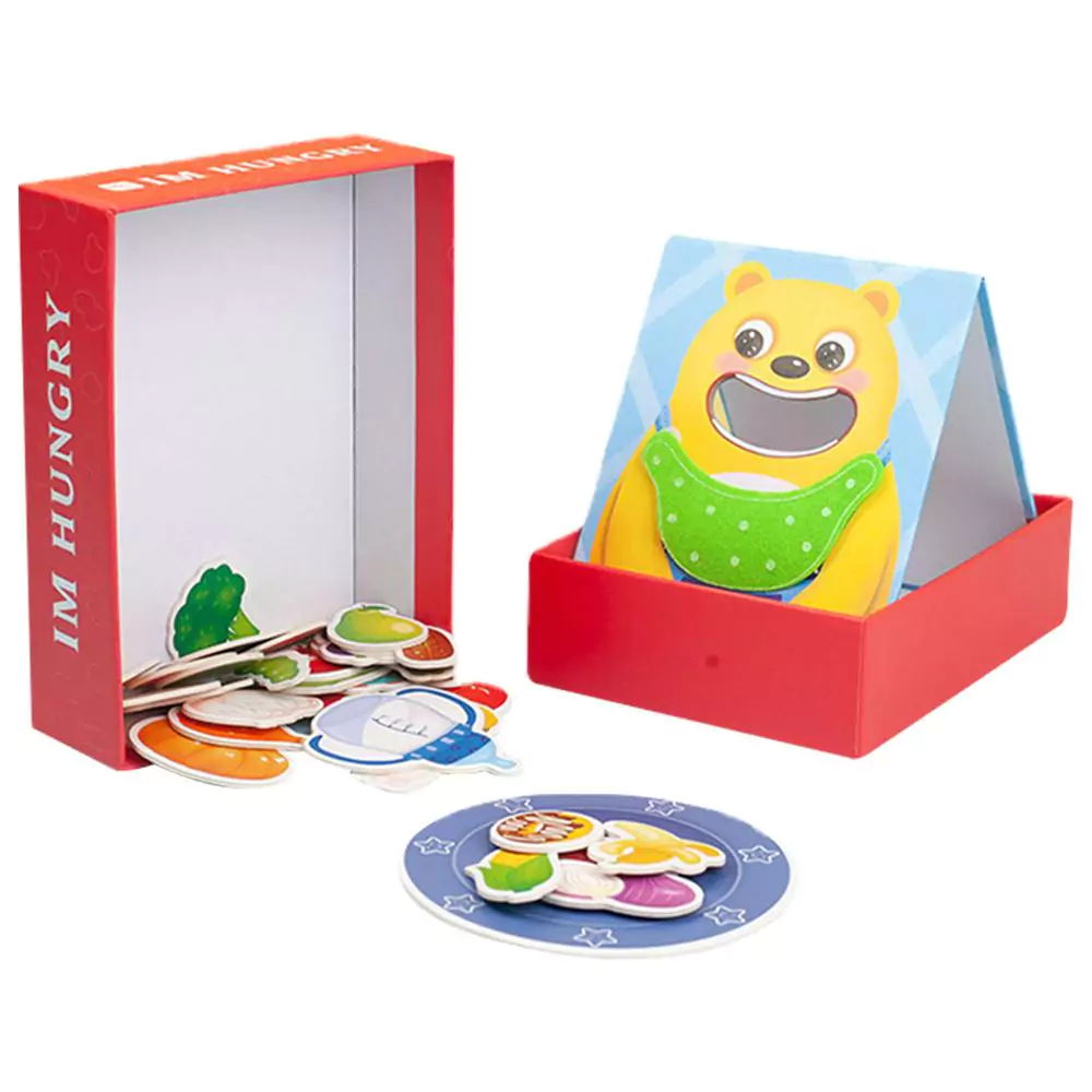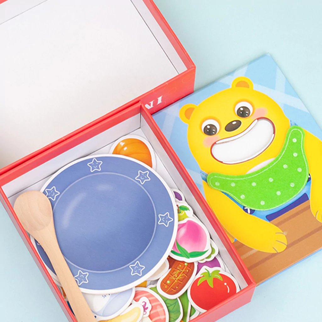 A embalagem inclui: 1 placa Urso , 1 colher de madeira, 1 Prato e 30 cartões de alimentos.